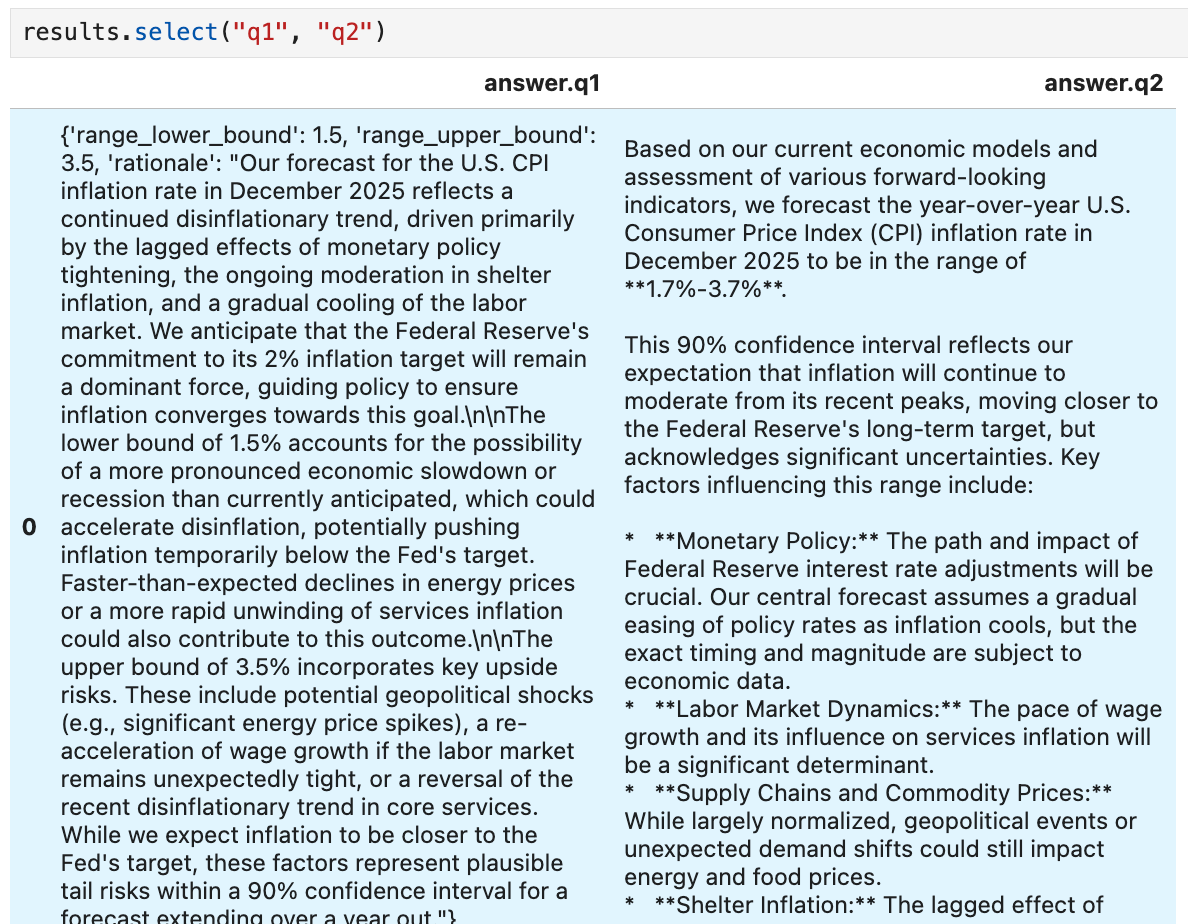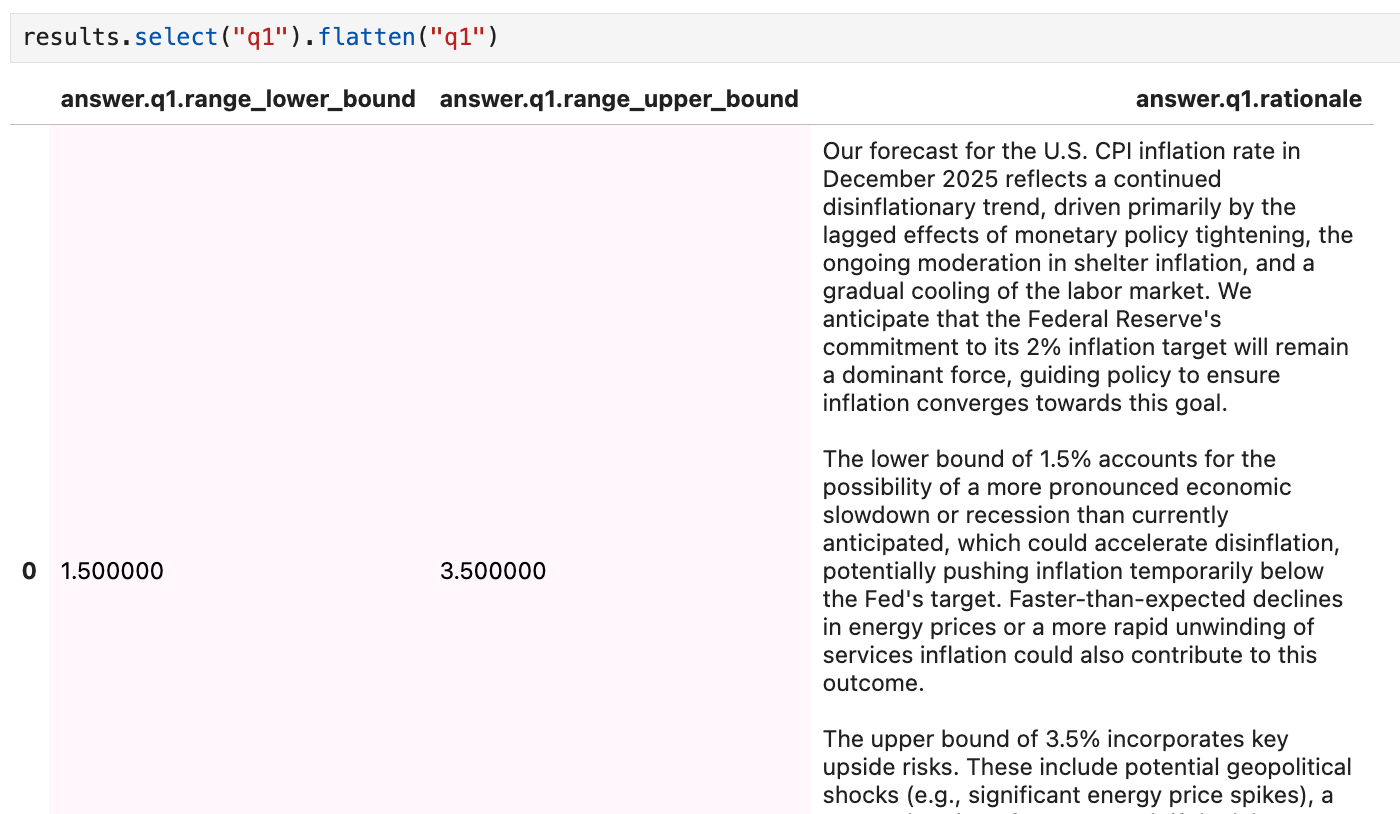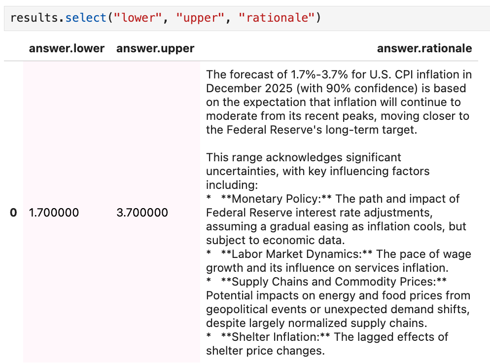 Let’s start with a forecasting question about U.S. CPI inflation in December 2025. We’ll frame it two ways, using different EDSL question types that allow us to specify the format of the model’s response: