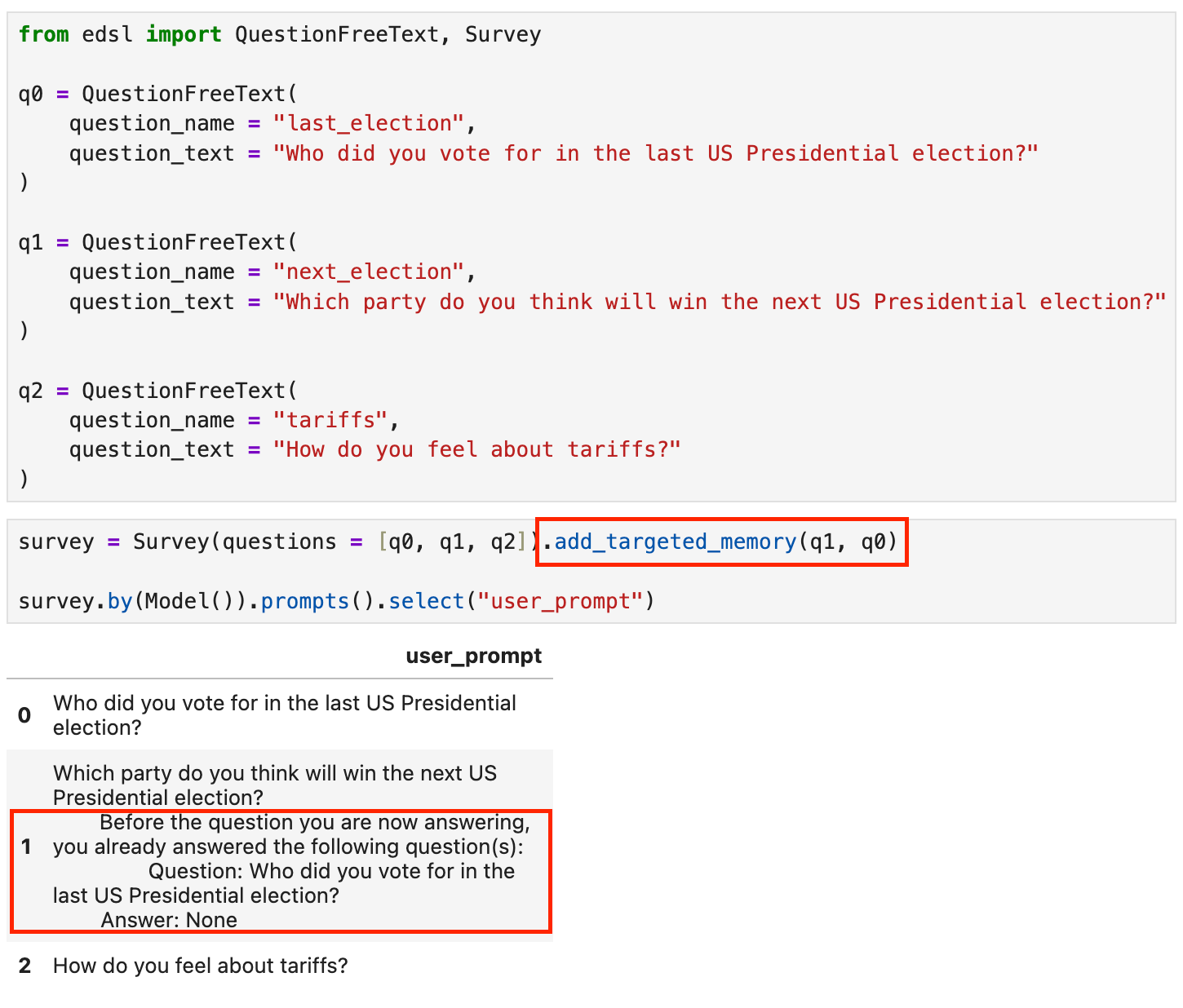 EDSL has built-in methods for adding context of questions and answers to other questions within a survey or experiment, giving you precise control over the information that is included in each prompt. These include: