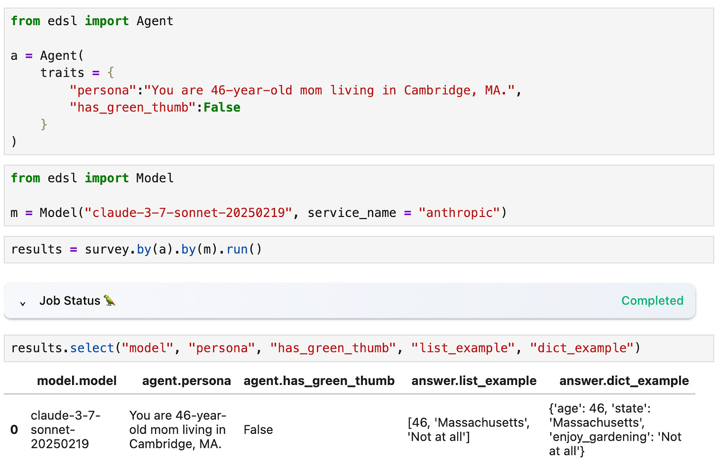 There are several ways to explore this in EDSL, our open-source Python package for simulating surveys and experiments with AI agents and large language models.