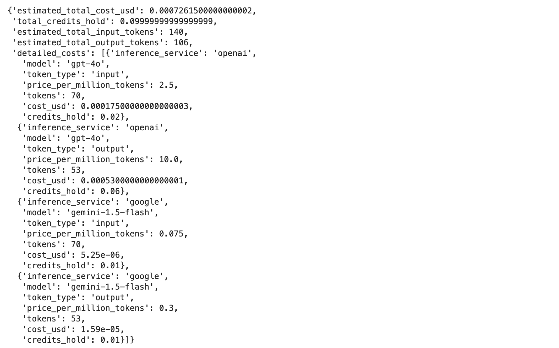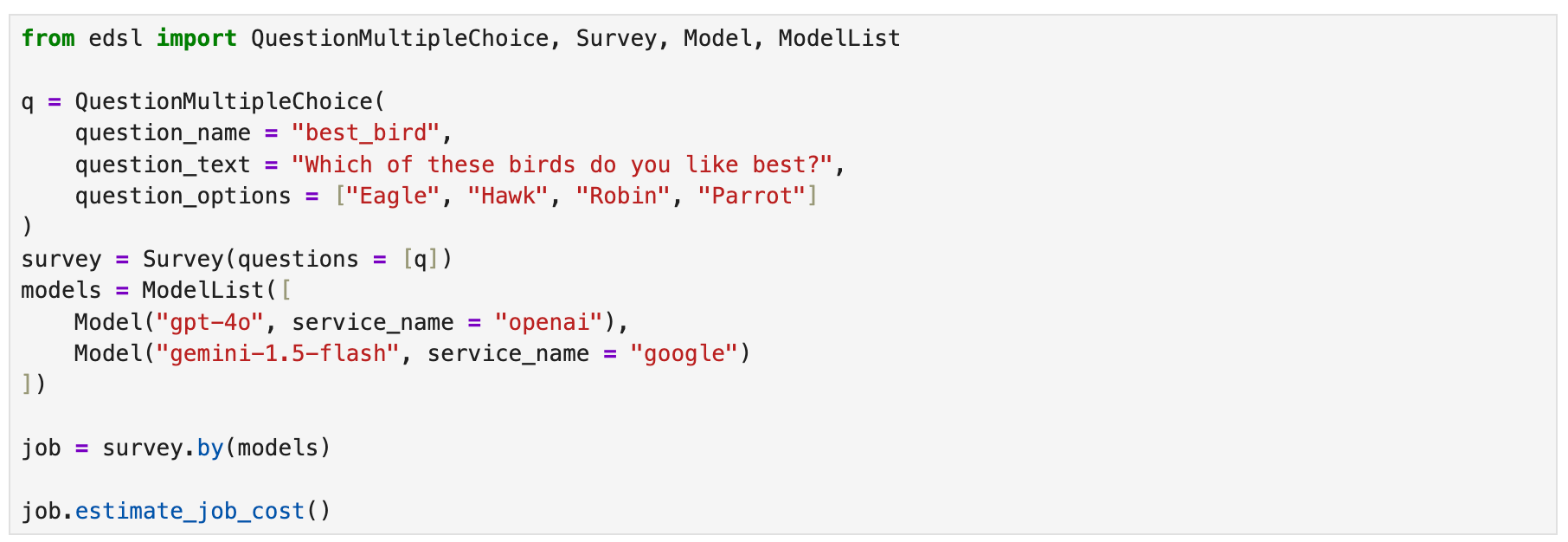 For example, here we create a simple question and then use a method for estimating input and output token costs of sending it to two different models. We can see the details also include the total credits that will be placed on hold while the survey job is running and then released when the actual cost is determined: