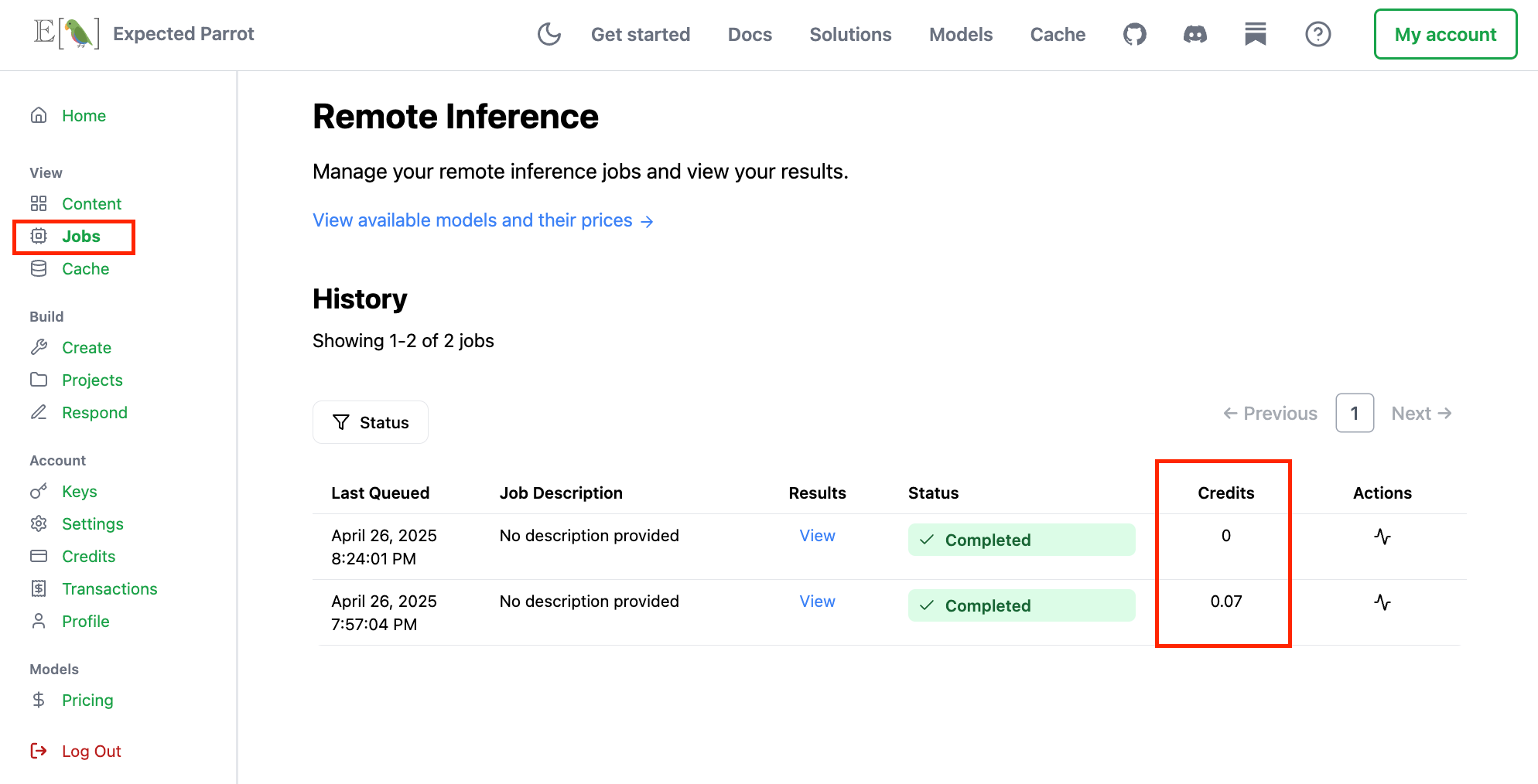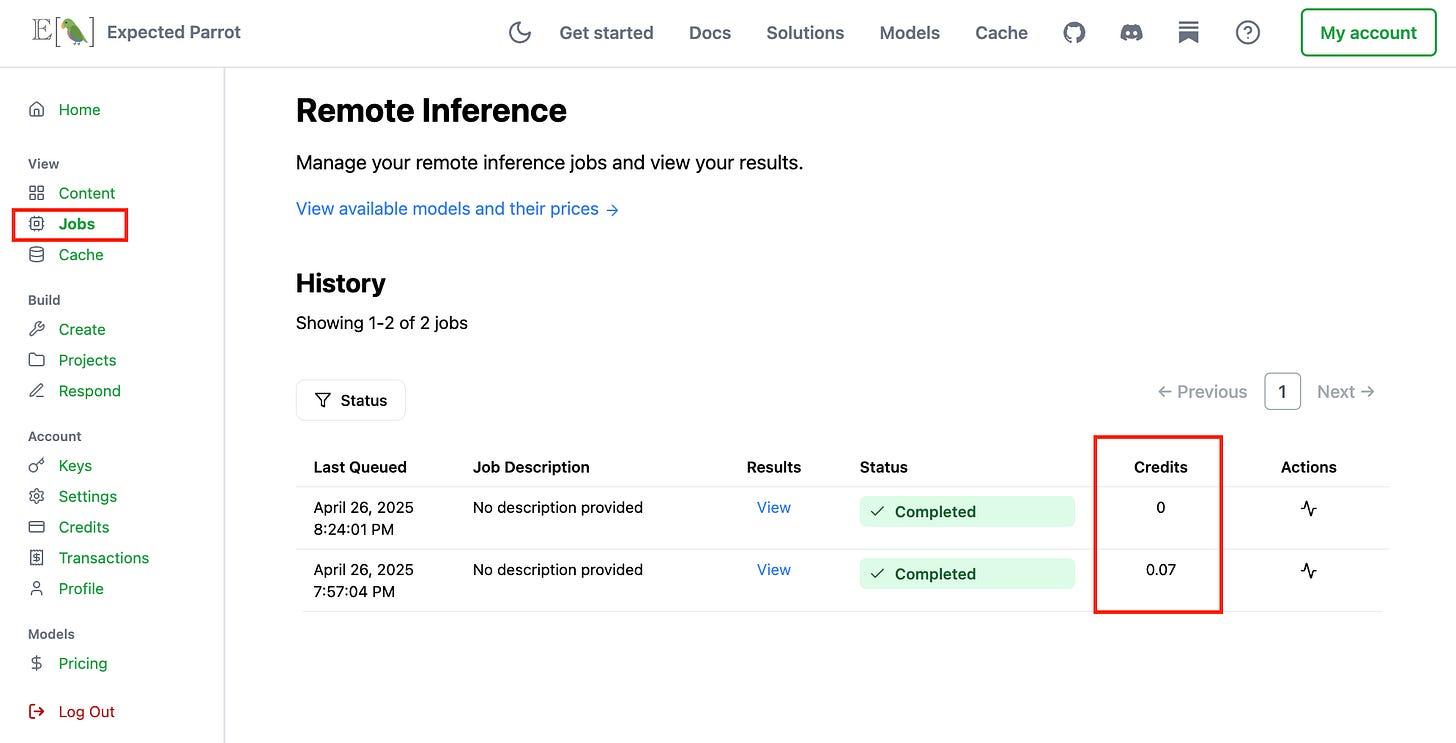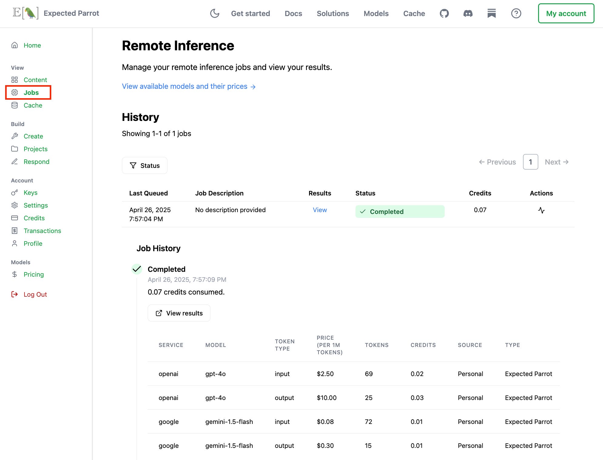 You can also view token and cost details at your Coop account. Your Jobs page shows the final cost in credits of API calls to each model used with the survey:
