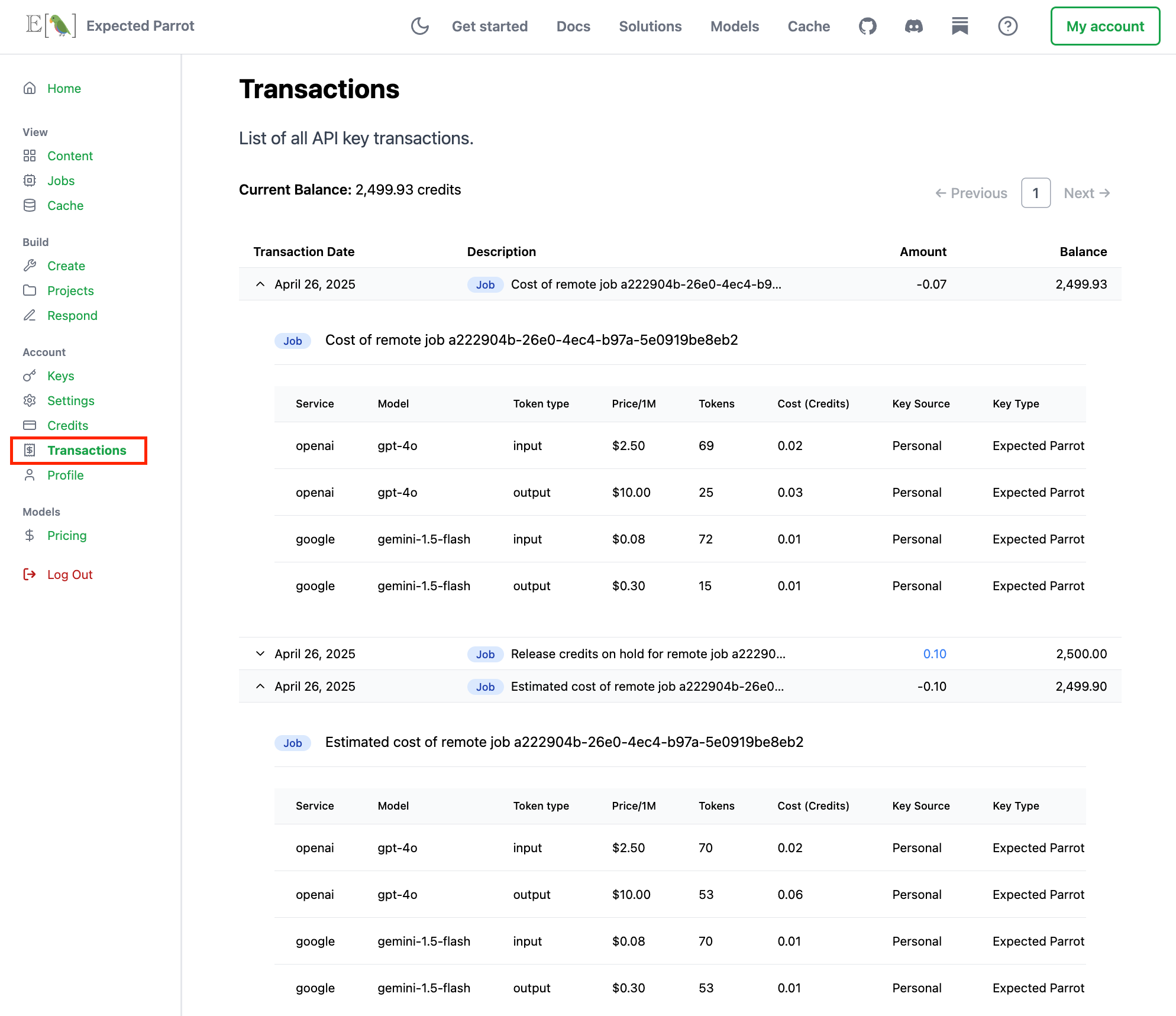 When you run a research project with Expected Parrot it’s easy to track the details of your LLM costs and usage, using built-in methods at your workspace and at your account at Coop, a platform for creating and sharing LLM-based research. You can also replicate and share your results for free. Below we highlight some new and key features for easily and precisely tracking your costs.