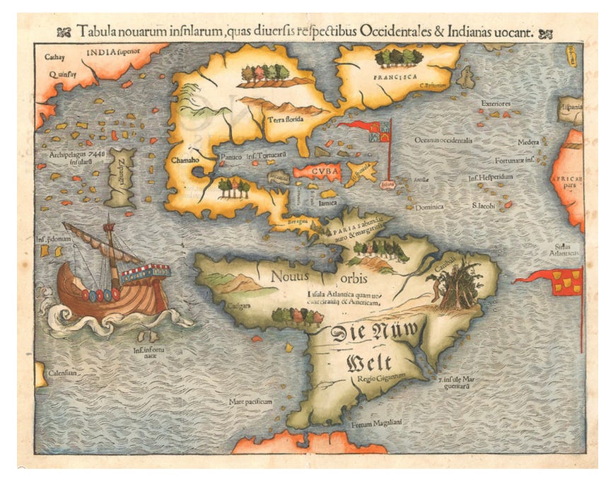 To make an analogy, a simulation is like a map. You can trace your finger on any path you like and have some sense of what that path will be like if you took it for real—steep or flat; wooded or grasslands; will I encounter a river? A mountain? Is there a pass through the range? The map will, of course, elide details. It will not tell you what kinds of flowers will be in the meadow, never mind whether they are in bloom when you hit the meadow. But you can be reasonably confident that the meadow is there, about where it is supposed to be. As such, you can use it to make plans. A map is a prediction technology and thus a planning technology. Of course, maps can be bad and maybe the meadow is not there. The "map is not the terrain" is a cliche but a cliche for a reason—it's true and important. This first map of the Americas basically gets it right but it has…some issues: